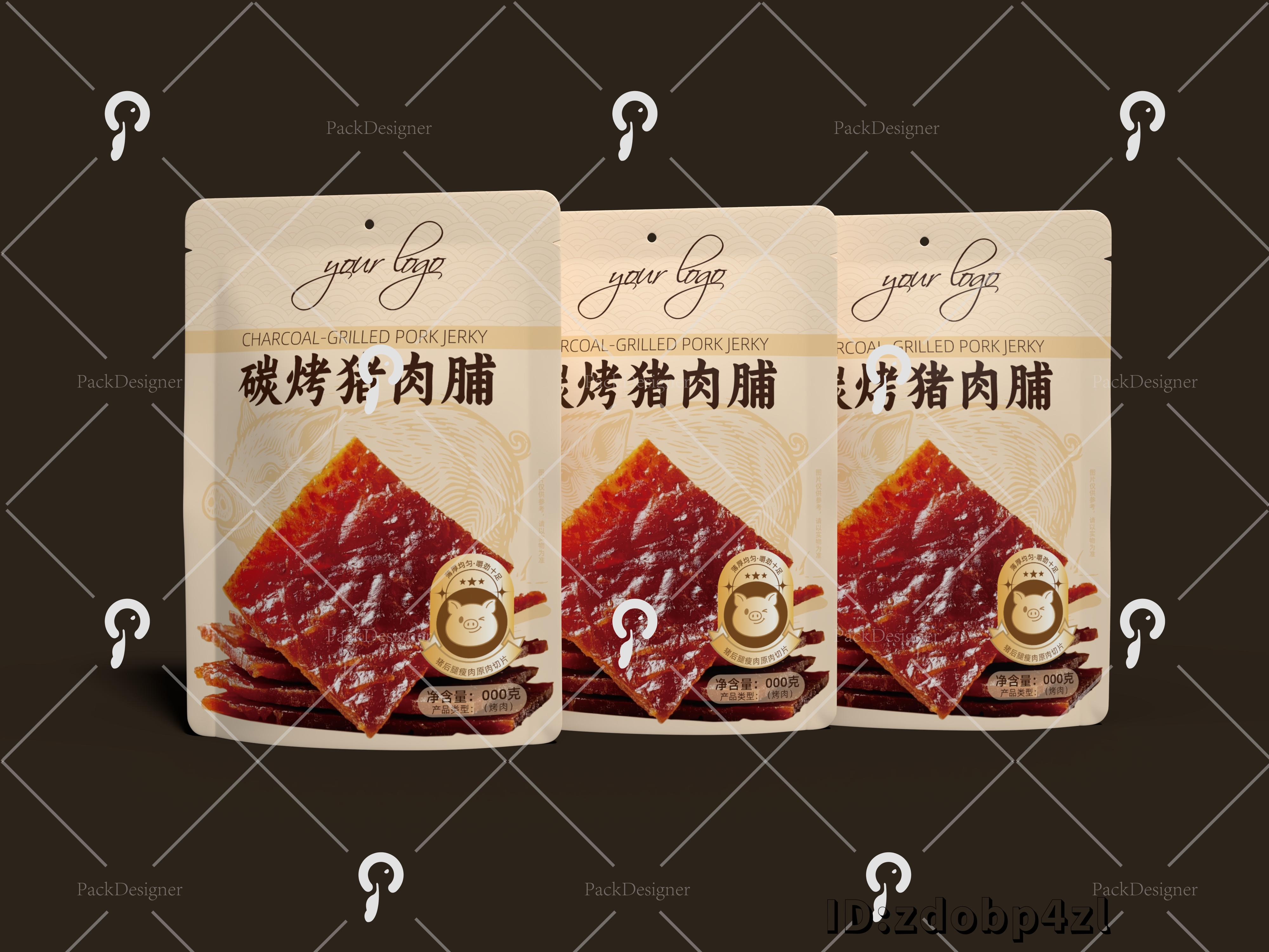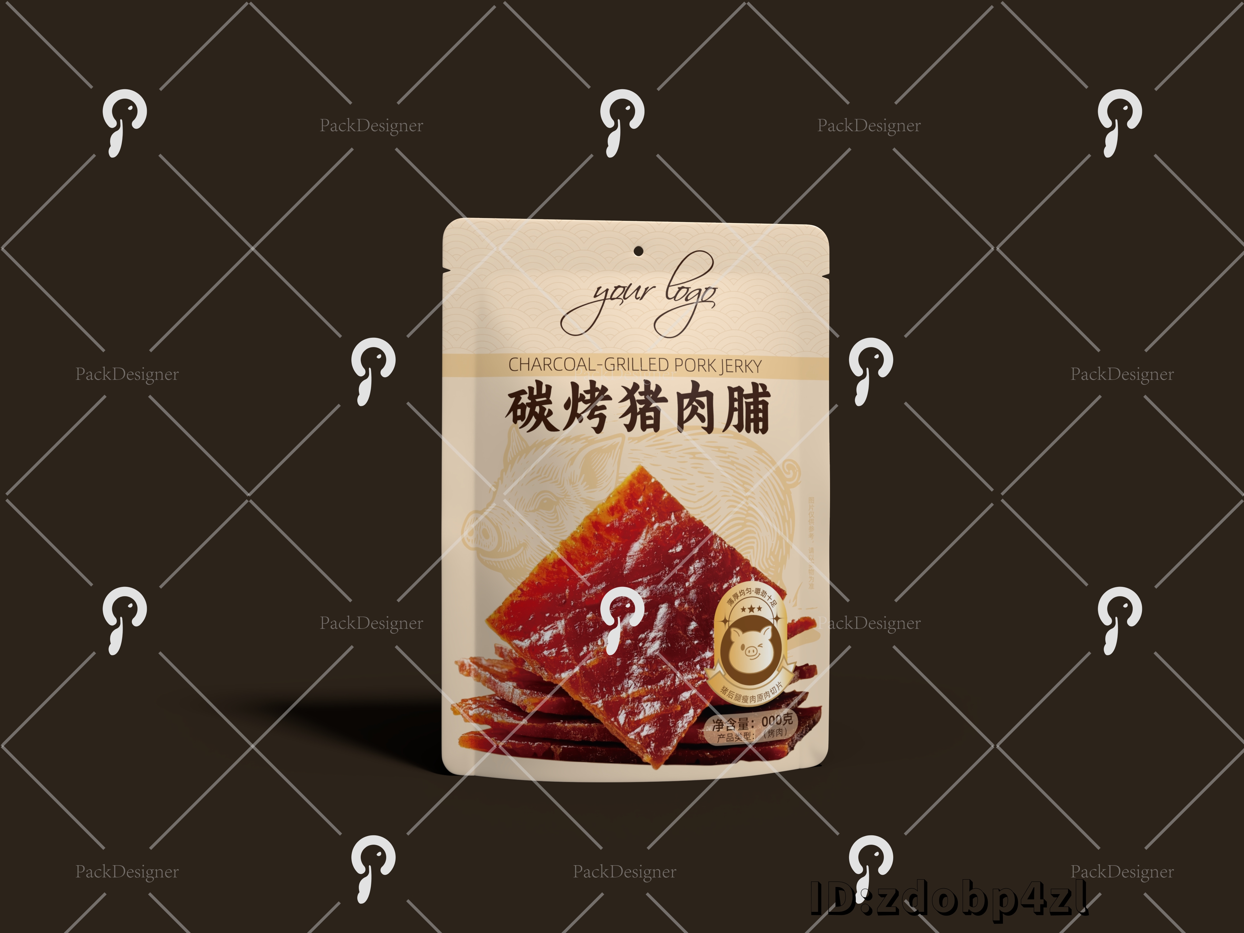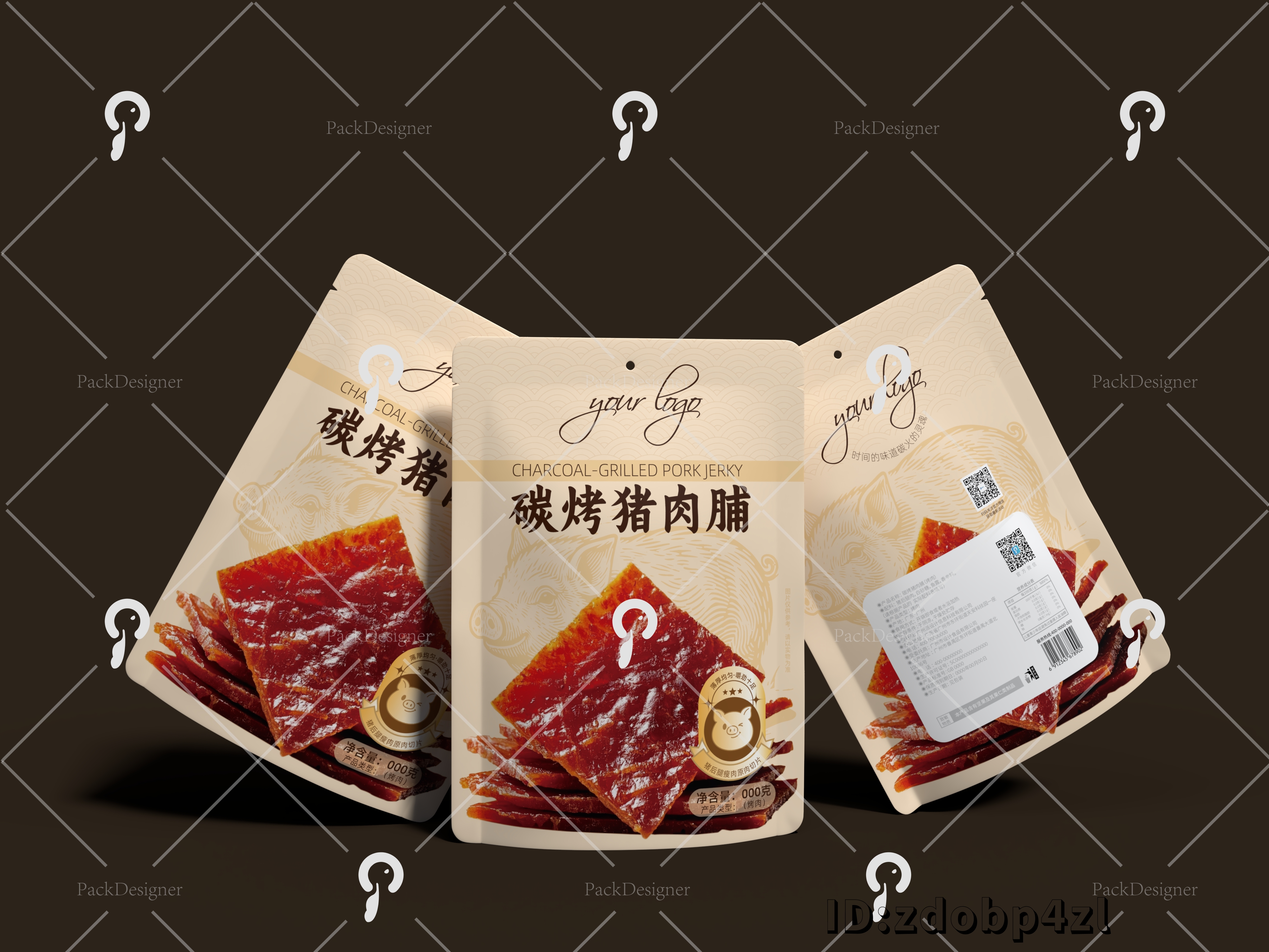 "CHARCOAL-GRILLED"碳烤字样直击味觉记忆,极简风格突出专业肉脯品牌形象,深色底纹隐喻传统碳烤工艺,通过文字力量直接传递焦香酥脆的口感体验,在同类产品中建立鲜明识别度。