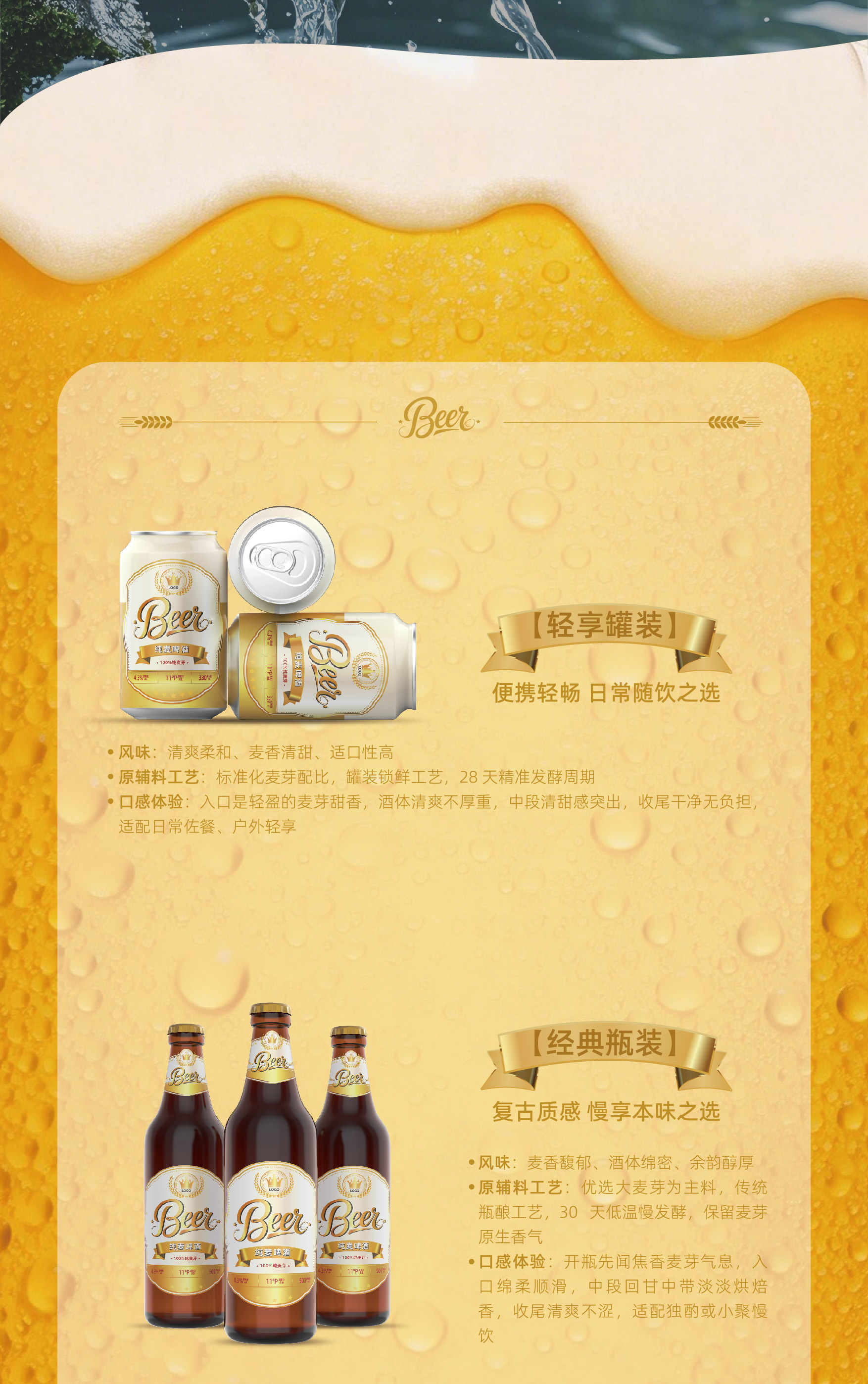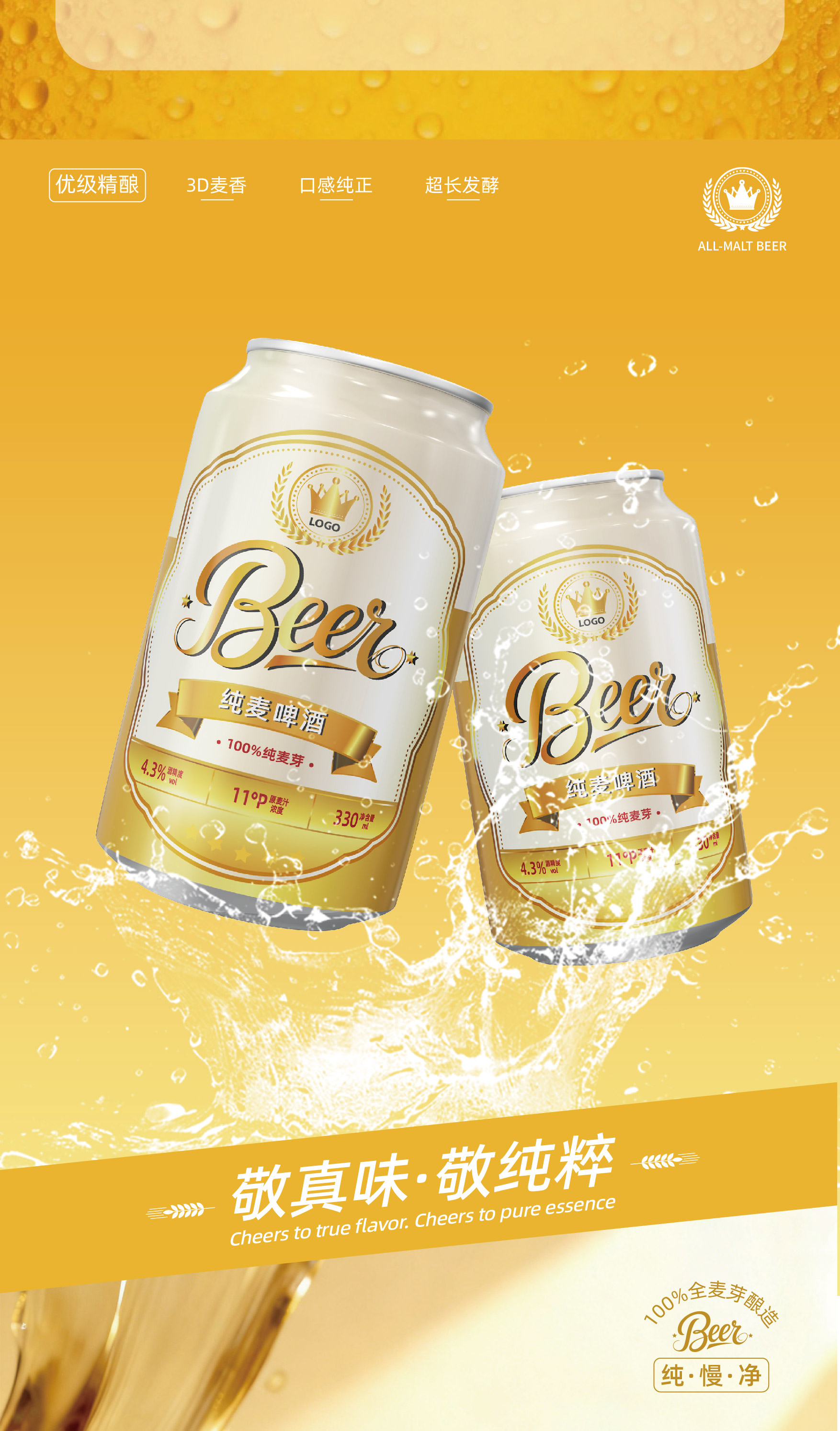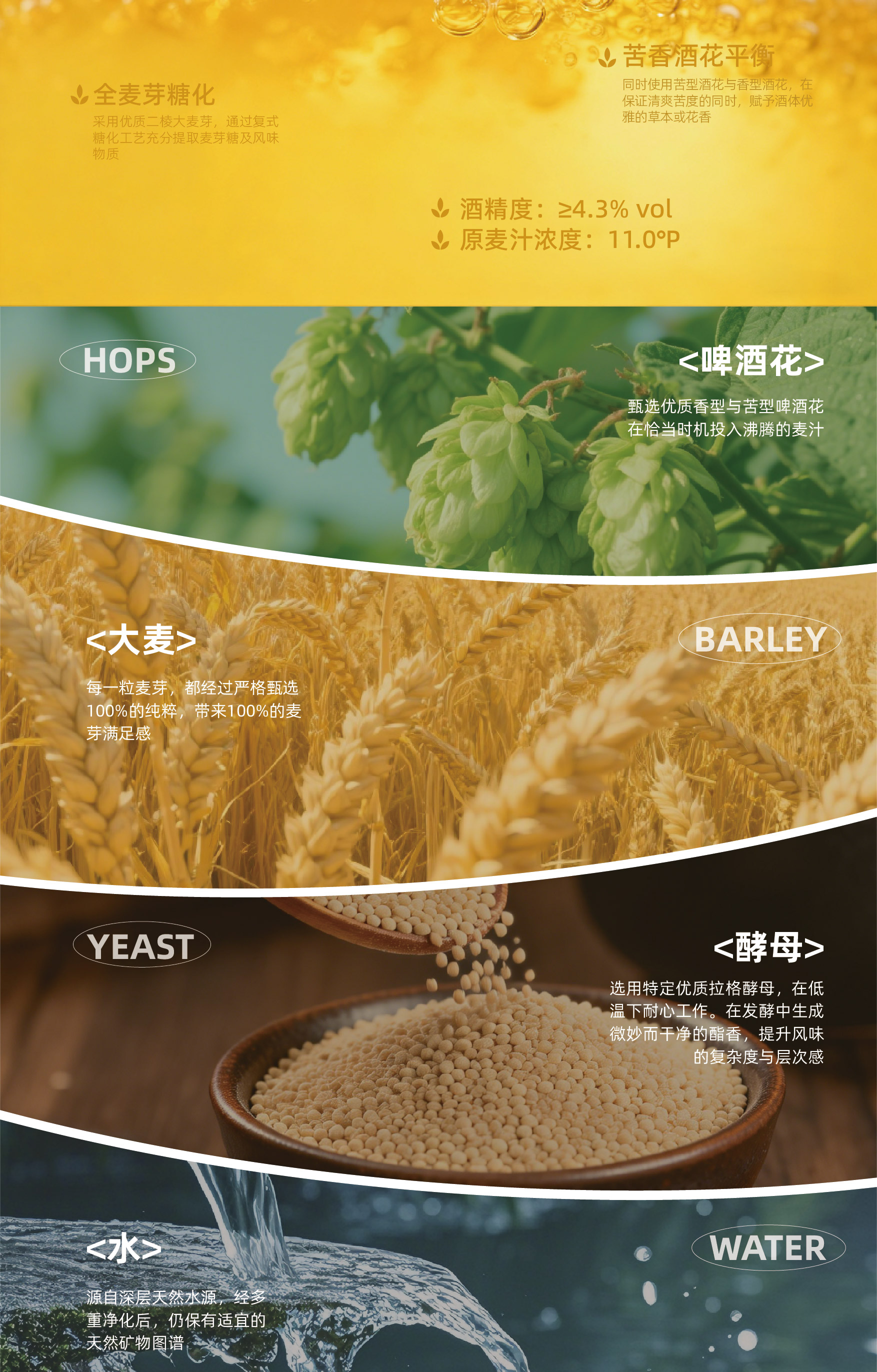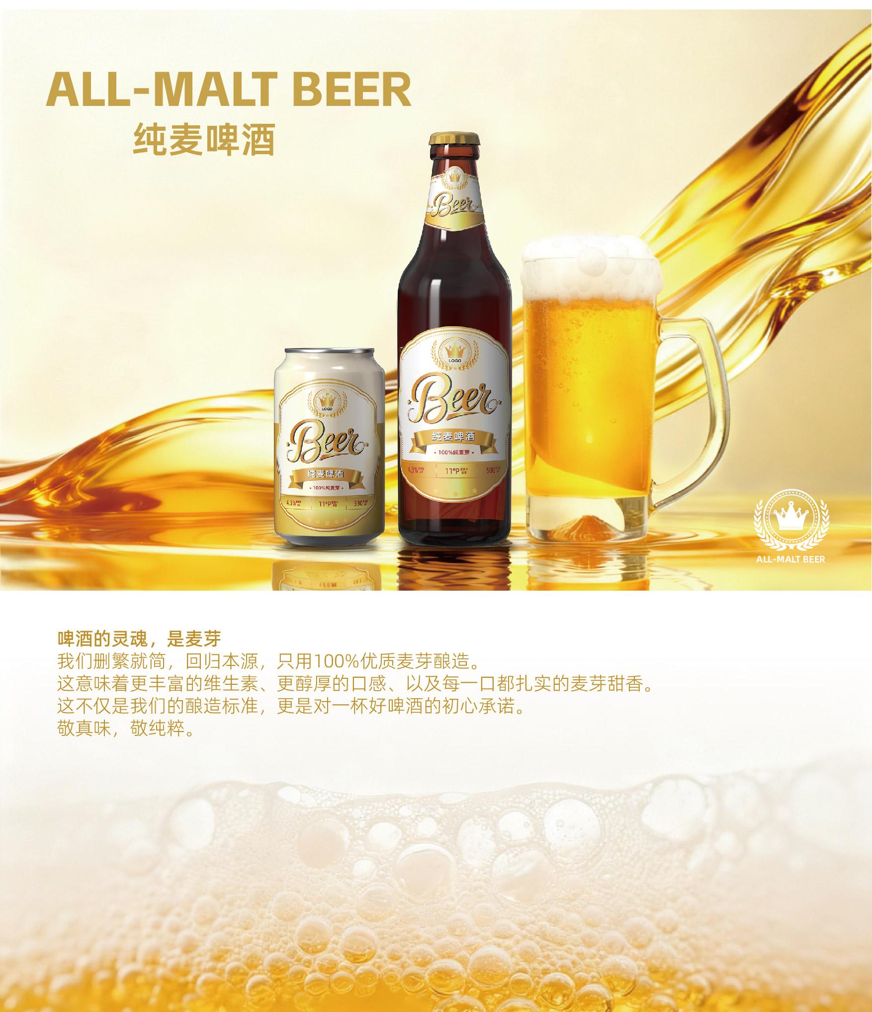 啤酒的灵魂,是麦芽 我们删繁就简,回归本源,只用100%优质麦芽酿造。 这意味着更丰富的维生素、更醇厚的口感、以及每一口都扎实的麦芽甜香。 这不仅是我们的酿造标准,更是对一杯好啤酒的初心承诺。 敬真味,敬纯粹。