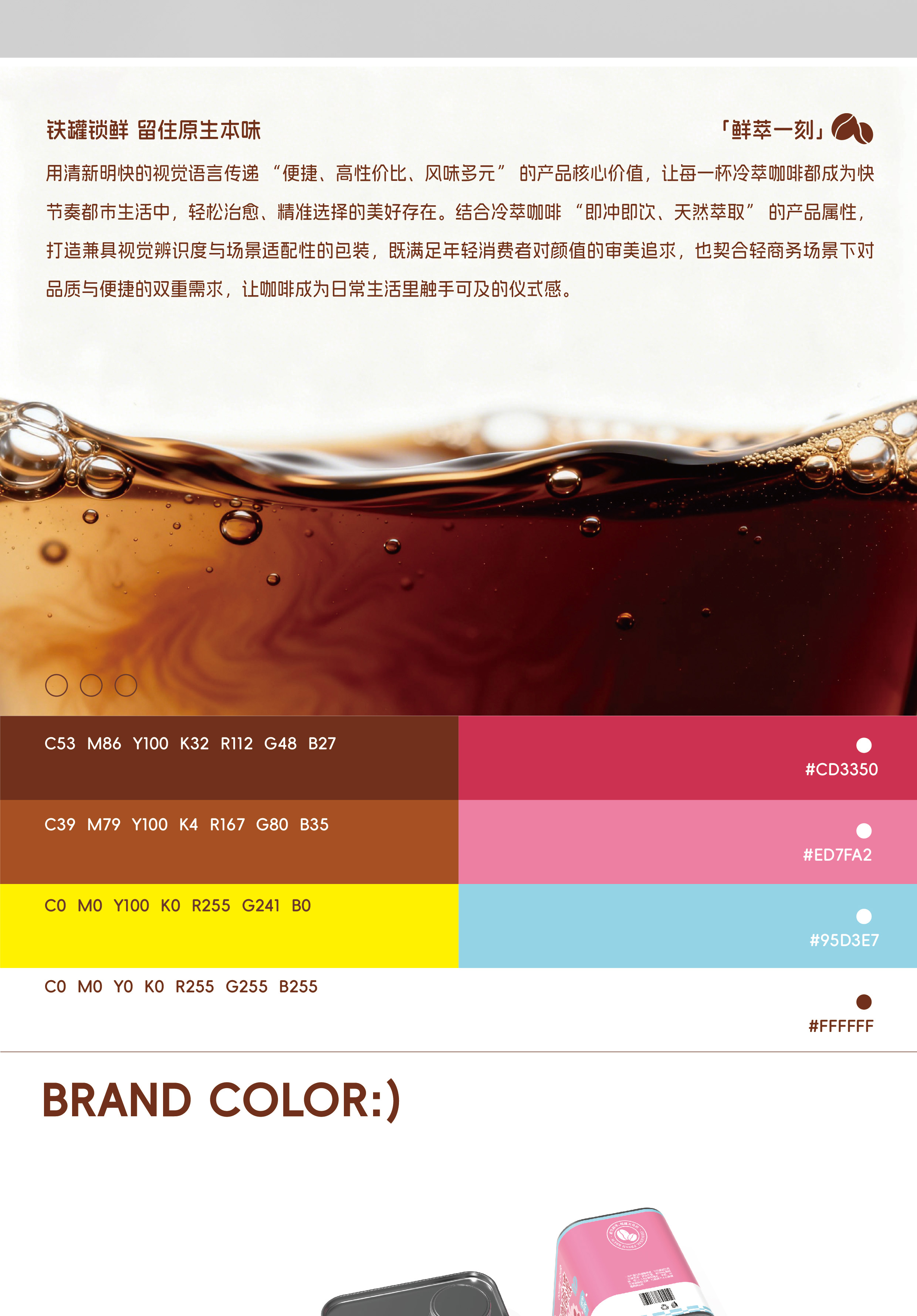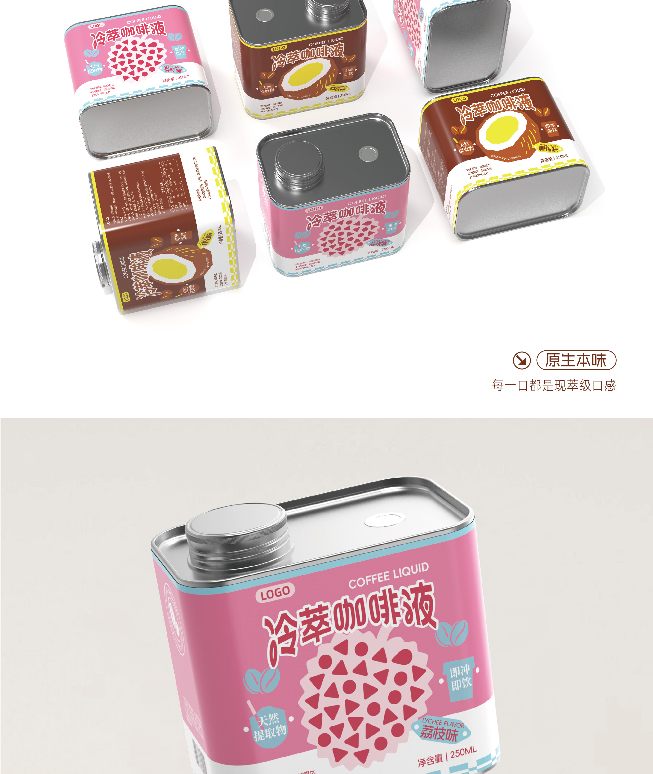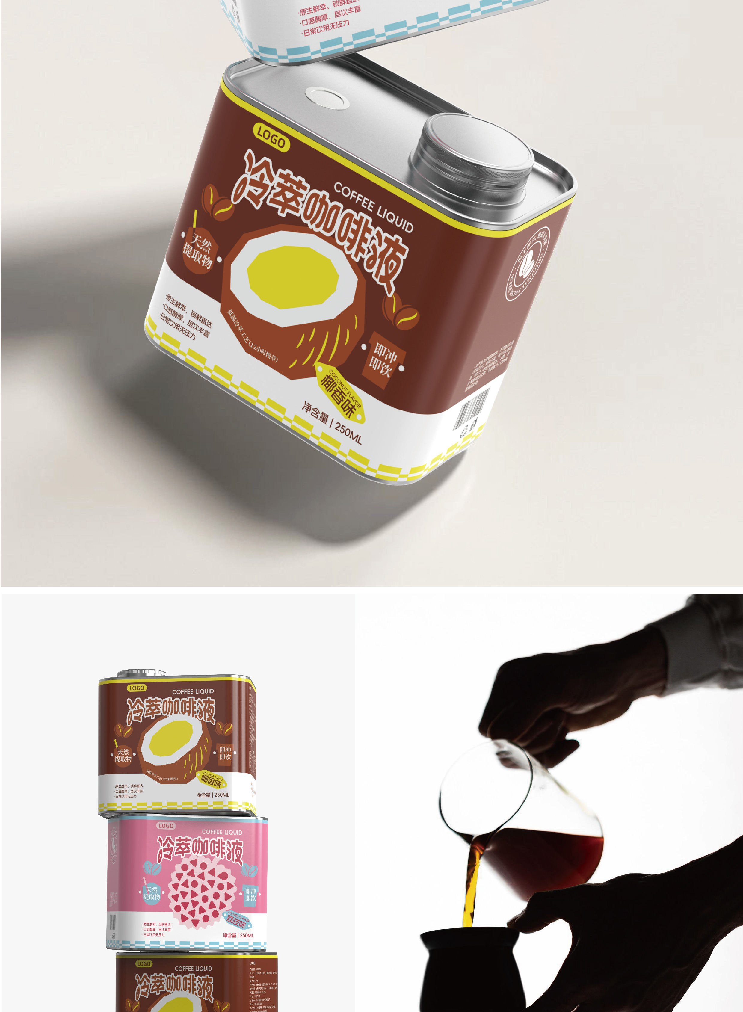 [冷萃咖啡液]用清新明快的视觉语言传递“便捷、高性价比、风味多元”的产品核心价值,让每一杯冷萃咖啡都成为快节奏都市生活中,轻松治愈、精准选择的美好存在。结合冷萃咖啡“即冲即饮、天然萃取”的产品属性,打造兼具视觉辨识度与场景适配性的包装,既满足年轻消费者对颜值的审美追求,也契合轻商务场景下对品质与便捷的双重需求,让咖啡成为日常生活里触手可及的仪式感。