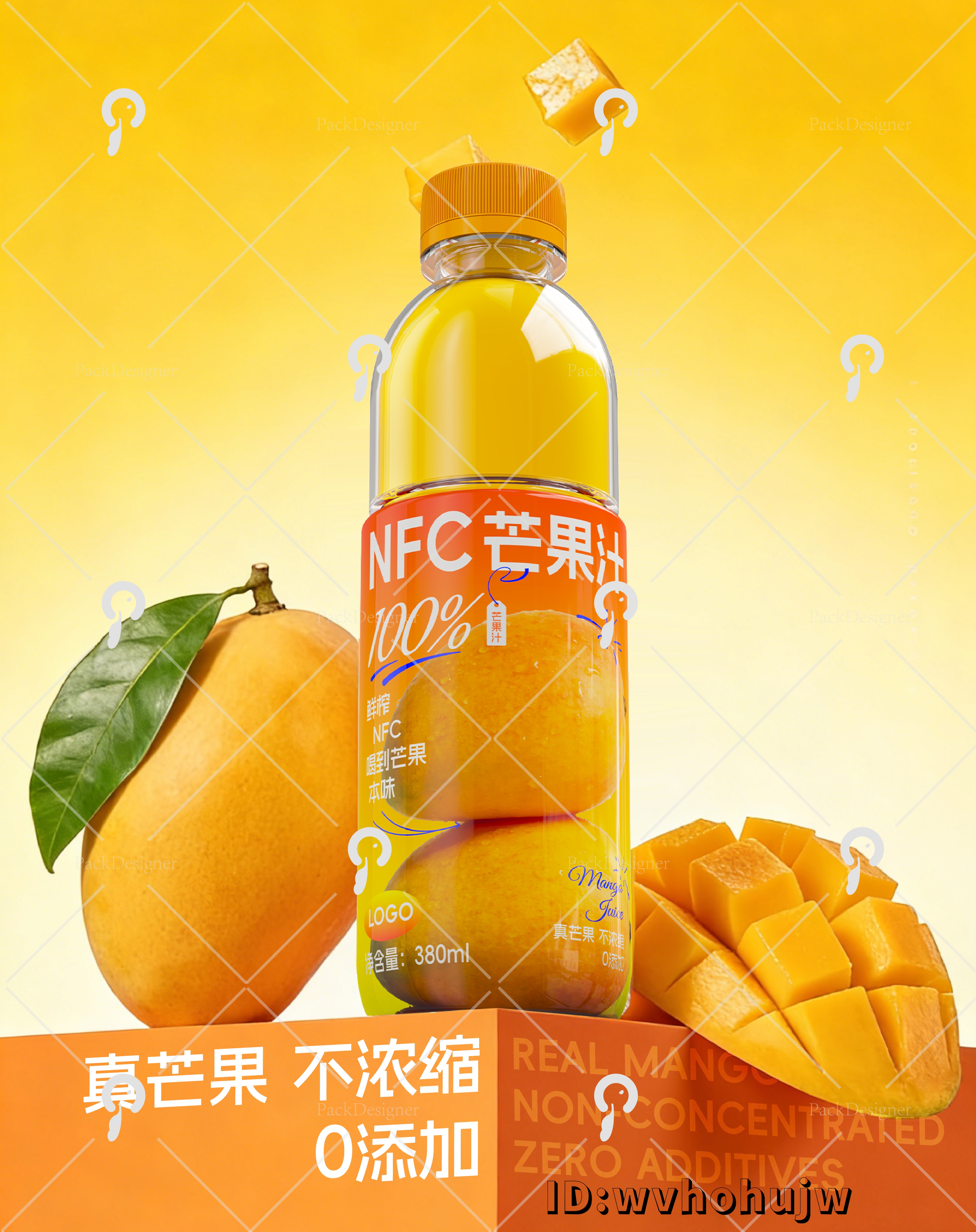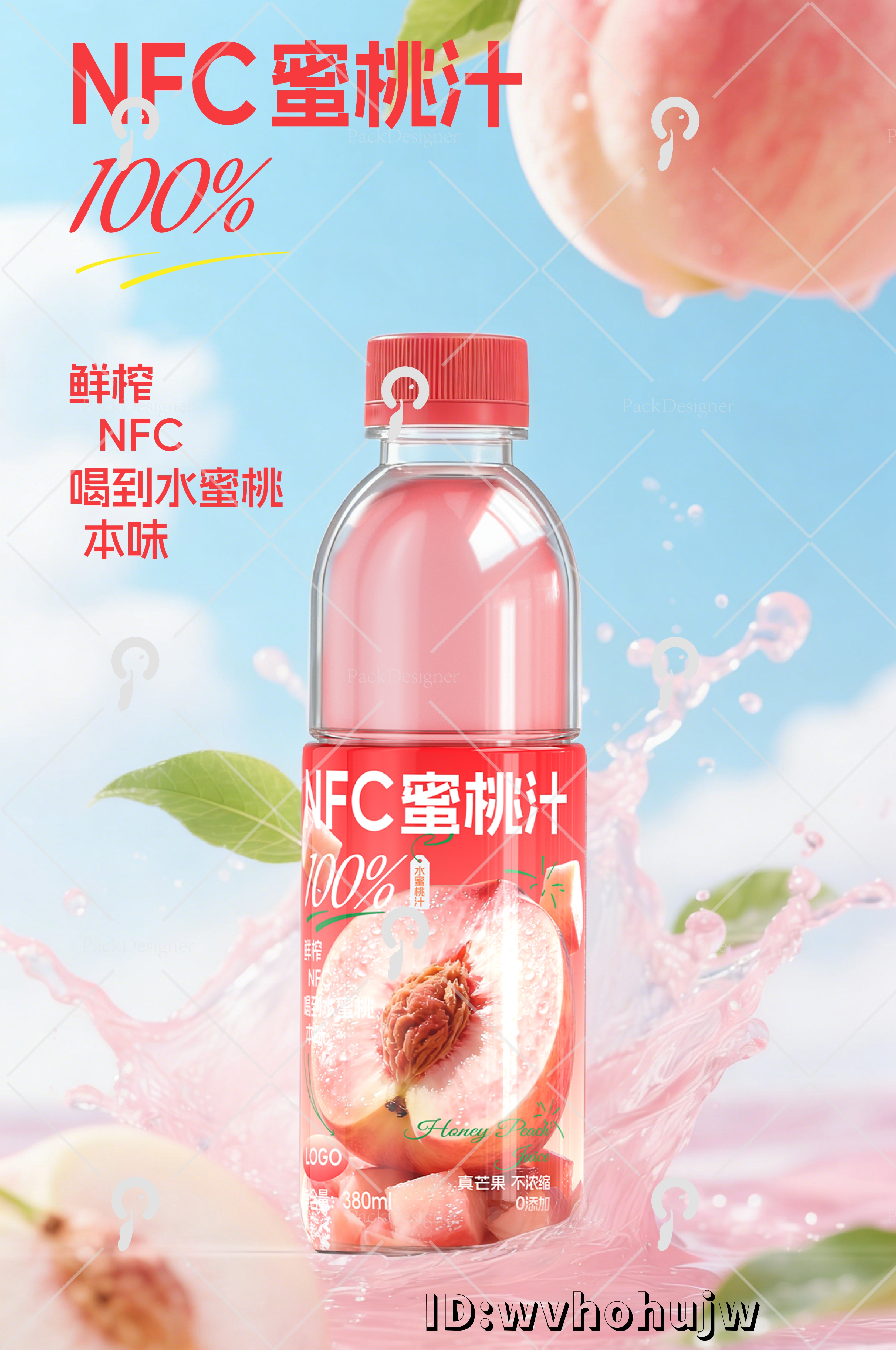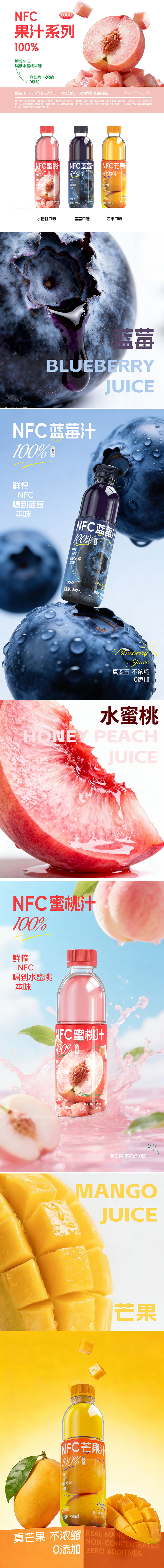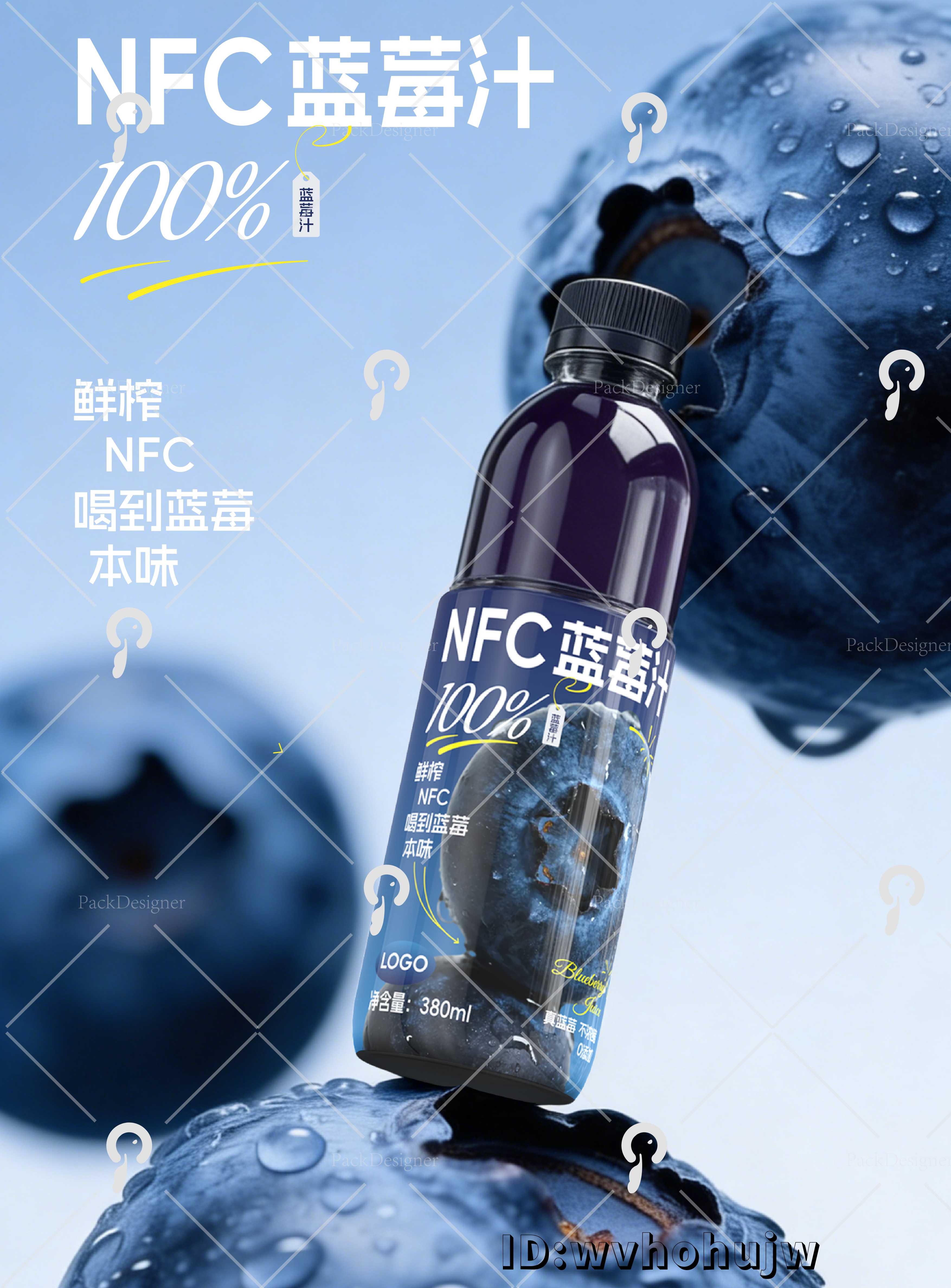 将 “NFC”、“鲜榨”、“喝到蓝莓本味” 等关键工艺与卖点有序排布在主视觉下方。字体搭配合理,既不显得杂乱,又能在 0.5 秒内完成 “是什么产品 + 有什么卖点” 的信息传递,非常适合便利店货架场景。